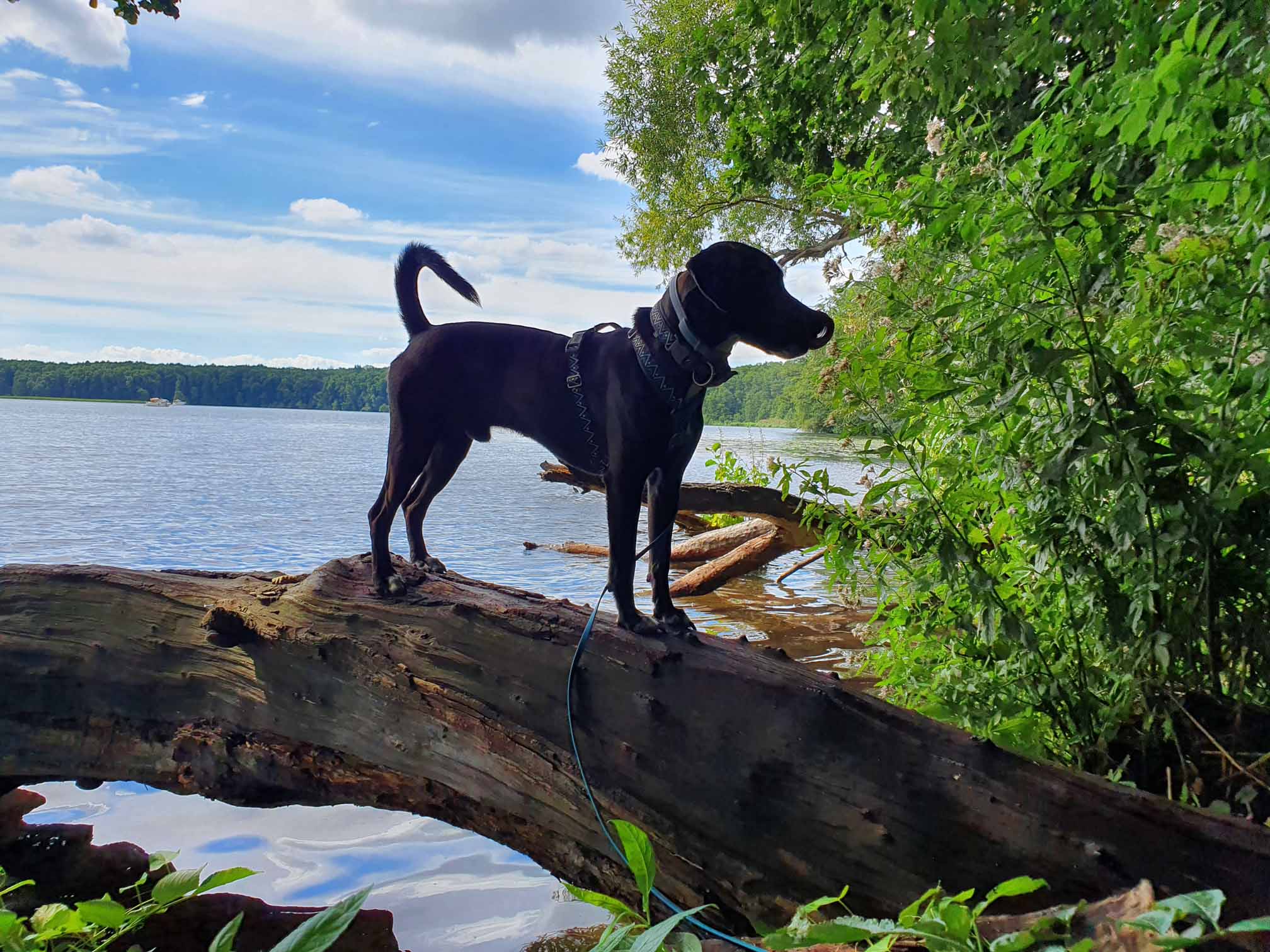 Für einen so schönen warmen Sonntag war die Strecke übrigens nicht besonders voll. Natürlich haben wir das gleich ausgenutzt und Floki gezeigt, dass er hier bequem ins Wasser laufen und die Pfoten abkühlen kann. Nach anfänglichen Zögern hat er durch wildes Spielen seine Vorsicht schnell abgebaut und den untergetauchten Ball aus dem Wasser geholt. Am Ende ist er sogar geschwommen – als Hundeeltern waren wir natürlich wahnsinnig stolz auf unseren eher wasserscheuen Hunde-Mitbewohner! Auf einem SUP fahren geht im Übrigen super klar,nur ins Wasser hopsen geht nicht – versteh einer diese Hunde! (verlinken)