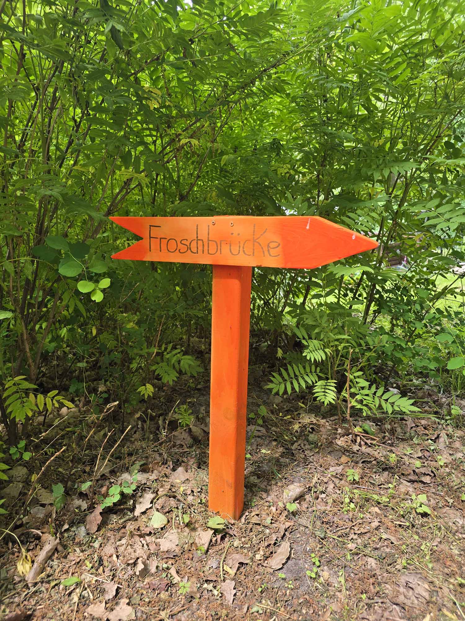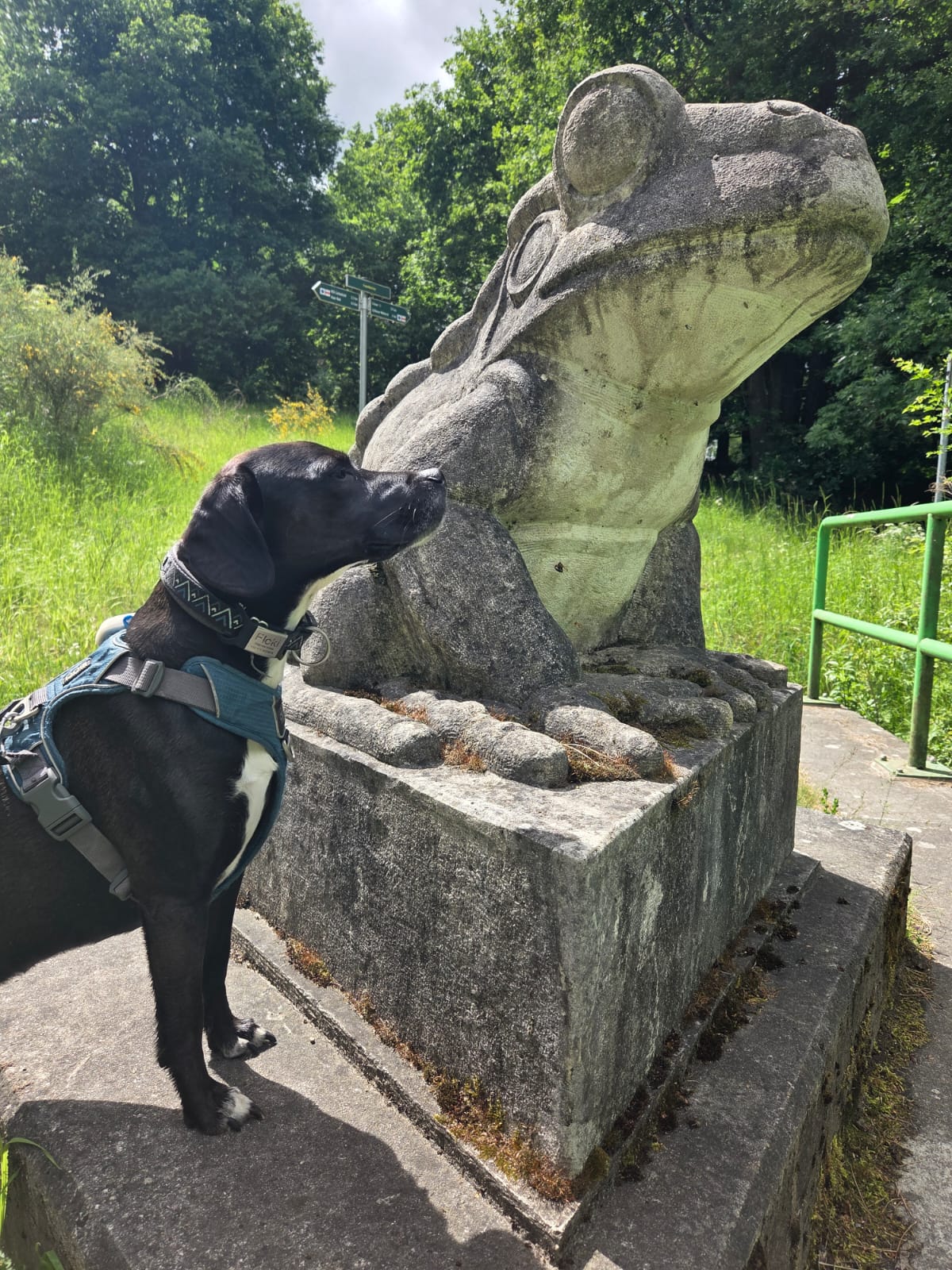 Es geht vorbei an der altbekannten Froschbrücke mit ihren Froschstatuen und über Weiden. Dort muss Floki immer in unserer Nähe blieben, um die anderen Tiere nicht zu stressen.